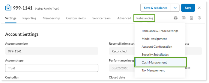Cash management starts at the individual account level. Cash Management on the Account Settings page allows you to add intraday cash, set up cash substitutes at the individual account level, and set cash reserves in the account. You can also see, at a glance, if the account has cash to raise or excess cash to invest.