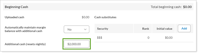 The amount of cash available in a client's account is updated with your daily upload. However, in some cases, you may want to deposit and use cash on the same day rather than waiting for the next daily upload to update the cash in the client's account. For these scenarios, you can use the Additional Cash setting to add and use cash on a same-day basis.