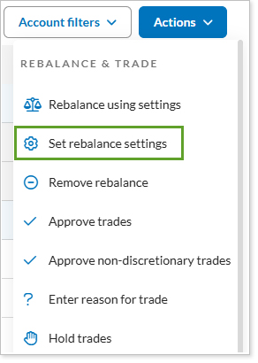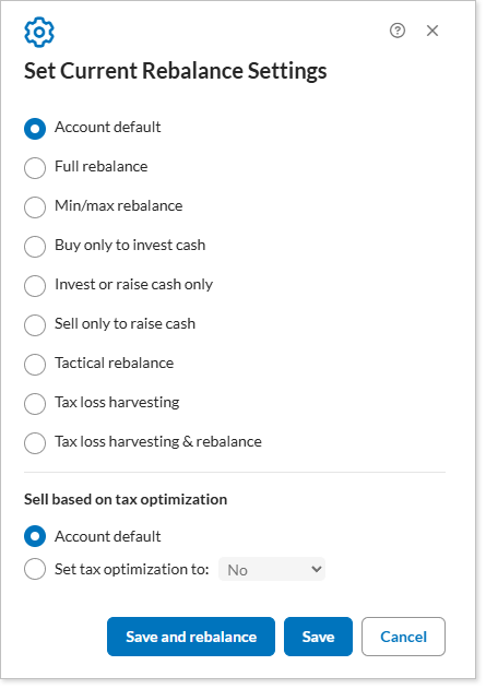 | Tactical Rebalance | This rebalance is used for individual models or submodels, rather than the account as a whole. Cash reserves are respected. |