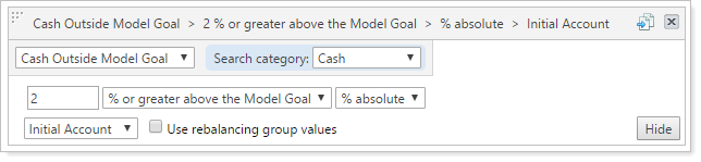 Cash Outside Model GoalFinds accounts with cash greater than its goal in the model. This filter ignores cash in reserves and looks at deviation from model cash targets. If you don't have cash in your models, this filter will still find cash reserves.