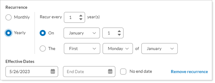 Choose Monthly or Yearly for the recurrence period.