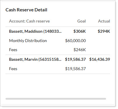 The Cash Reserve Detail widget gives you insights into the cash reserves set for the account or group you're viewing. If you're viewing a group, you can see details about any cash reserves set in each underlying account, including goal and actual amounts.