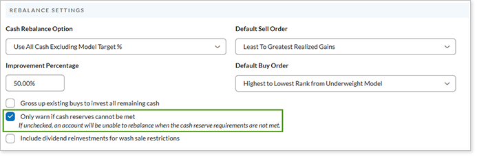 The Rebalance Settings on the Rebalancing System Settings page allow you to change how you ware warned about cash reserves during a rebalance using the Only warn if cash reserves cannot be met option. When you select this option, Tamarac Trading only warns you during a rebalance if cash reserves cannot be met. If you clear this option, Tamarac Trading prevents a rebalance if cash reserves cannot be met.