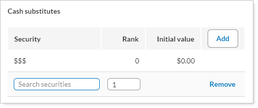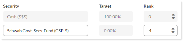 If Tamarac Trading needs to generate cash during a rebalance, the cash substitute securities will be sold in order of rank, with 0 being the highest sell priority. The $$$ ticker must be ranked 0.