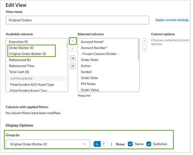 The platform retains the Original Order Blotter ID on downstream orders when they’re partially filled, fully filled, and reconciled, even if the original order is deleted.