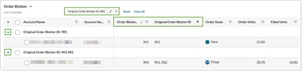 To track orders associated with their original orders, in Order Blotter, group by Original Order Blotter ID.