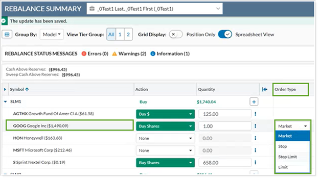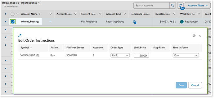 With this enhancement, we’re adding the ability to enter order instructions for multiple accounts before you approve the orders. You’ll be able to select multiple accounts on the Rebalance page, then from Actions select Edit Order Instructions.