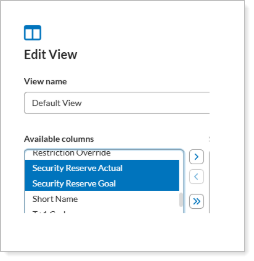 Rebalance page. View real-time security reserve balances against goal amounts on the Rebalance page in the new columns Security Reserve Actual and Security Reserve Goal.