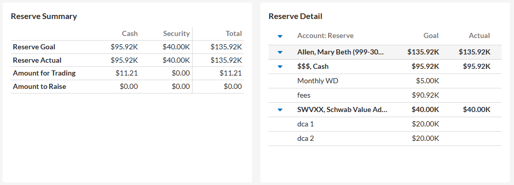 Rebalance Summary report. See combined cash and security reserve goals and values in the Reserve Summary and Reserve Detail widgets. If the account is rebalanced, we show the post rebalance values.
