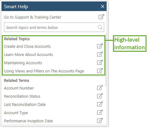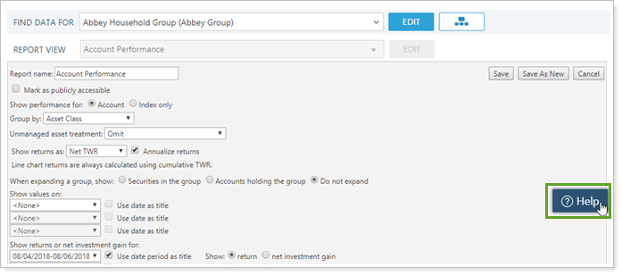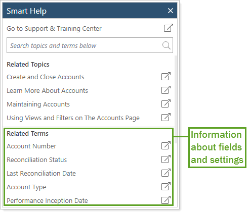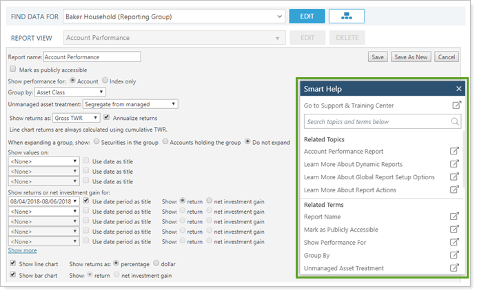 Smart help answers questions like "What's the difference between showing return versus net investment gain on an Account Performance report?" and "What happens when you combine group positions on a holdings report?" This tool allows you to: