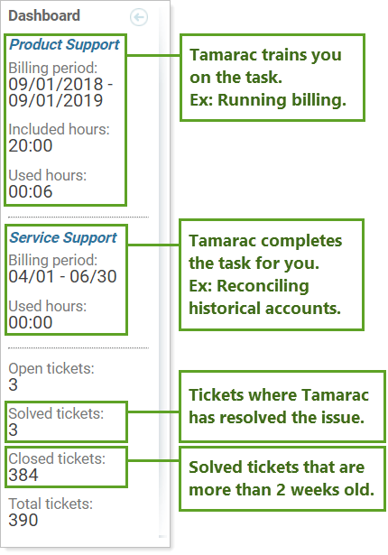 Service Support is tracked for quarterly service support hours used. If you want to review total annual hours used, consult your Tamarac invoice for previous support service hours used, or contact your dedicated Tamarac Support.