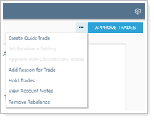 The updated Rebalance page combines functionality of the Rebalance and Rebalance Review pages. Here, you can see your accounts and groups, review trades, approve trades, and see all trades in one place. In addition, you can use page views, column filters, and account set and saved search filtering to view only the accounts you want to.