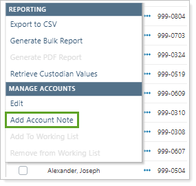 To add a note to one or more accounts or groups, you can select them and then choose Add Account Note in the Actions list.