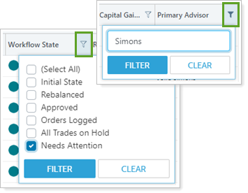 The updated Rebalance page also has updated columns that allow you to add granular filters to find just the accounts and groups you're looking for. Need to address accounts and groups with problem rebalances? Filter Workflow State by Needs Attention. Need to find accounts assigned to a particular advisor? Type the name into the Primary Advisor column filter to find what you're looking for.