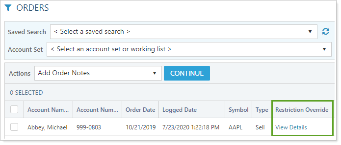 In this release, we removed that gap. Now, if you send logged orders back to the Trade List page, any restriction override details will stick with that trade, and you can review details about the restriction and approval notes by clicking View Details in the Restriction Override column.