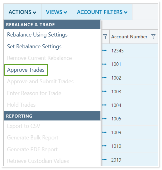 First, the Approve Trades option now appears in the Actions list.