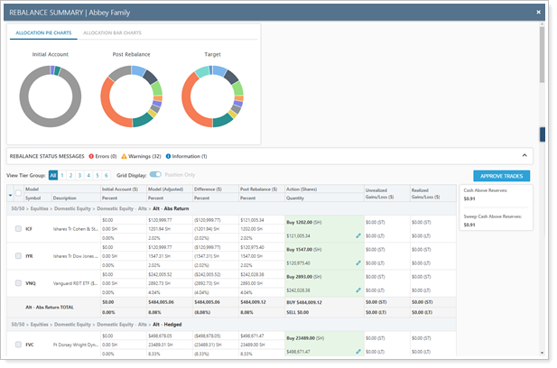 The Rebalance Summary report is a useful and necessary part of the trading workflow. This report allows you to see a visual representation of rebalances, create custom one-off trades, and visually see the results of your trading decisions.