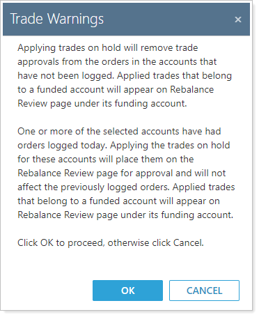 In addition, if you have an account where some of the trades are on hold and other trades are logged and you apply the trades on hold, only the held trades will return back to the Rebalance page for review and approval. However, in the same scenario where you have some trades applied and some placed on hold and those applied trades are not yet logged, you will see all trades for the account return to the Rebalance page for review and approval.
