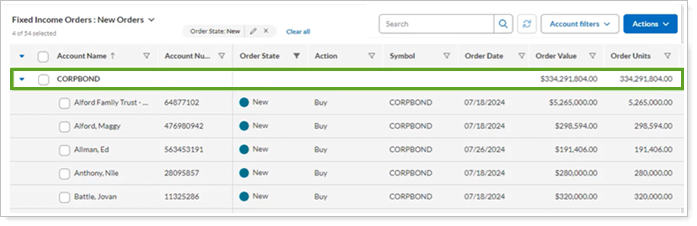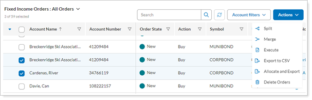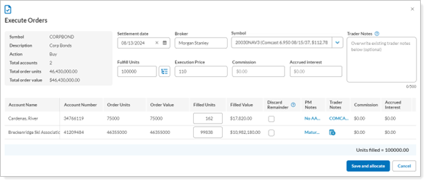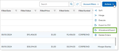 Allocate filled orders to client accounts in Tamarac. As the bond trader, you’ll still need to handle the actual allocation of bond units to client accounts at the custodian or executing entity using the CSV export provided.