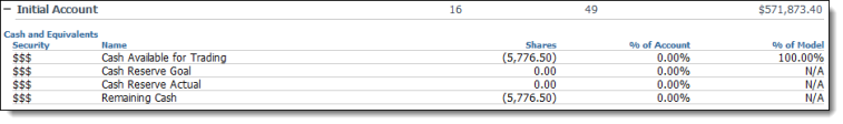 Cash available for trading | The total amount of cash that is available for trading. This is the amount of cash that exceeds the cash reserve goal as well as is above the total cash reserve upper threshold. This amount will be negative if the account needs to raise cash to meet its cash goals and is below the total cash reserve lower threshold. |