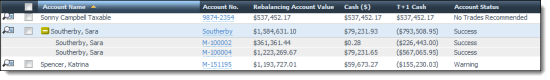 To make it easy to filter out accounts without buys and sells, Advisor Rebalancing now sets the account status on the Rebalance Review to "No Trades Recommended" when it does not have any trade recommendations. Before this enhancement, Advisor Rebalancing set the status to "Success" or "Warning."