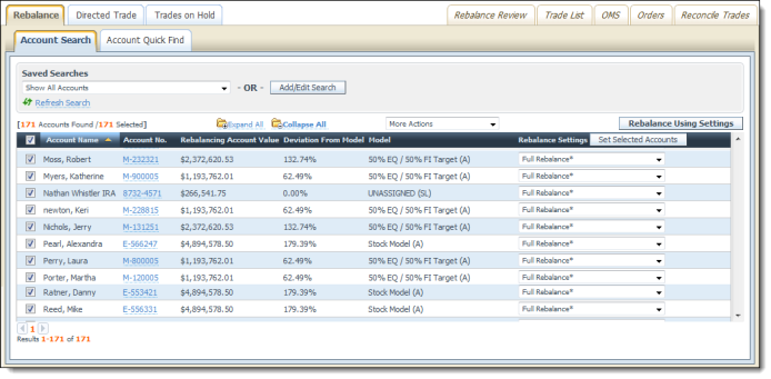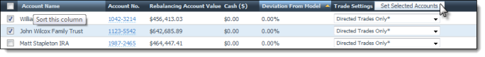 When viewing accounts in a list, such as on the Rebalance & Trade page, it is now easier to make changes to more than one account at a time without making changes to all of your accounts. Before this enhancement, users were only able to make changes to all accounts or one account at a time.