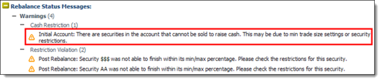 Error message.Informs you about a situation that requires action before the rebalance can continue, such as "The account has a negative total value. Please check the cash reserve amounts on the account." Error messages prevent Advisor Rebalancing from rebalancing the account.