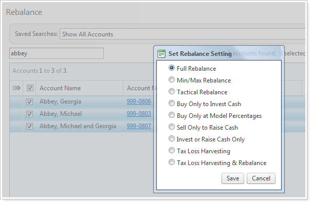 In the Set selected accounts dialog, select the appropriate option and then click OK. Advisor Rebalancing updates the accounts you selected.