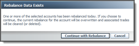 When rebalancing an account, Advisor Rebalancing will now let you know if the account has already been rebalanced. This new warning message will prevent users from inadvertently losing rebalancing information or trade files.