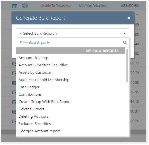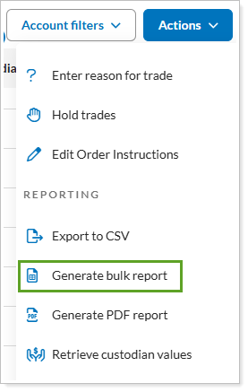 To help you view and analyze your clients' account data further, you can now generate bulk reports for the accounts and groups you select on the Rebalance page by selecting Generate Bulk Report in the Actions list.