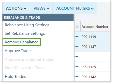 The new Remove Rebalance option lets you remove the rebalance data for the accounts and groups you select and puts the selected accounts or groups into the Initial rebalance workflow state.
