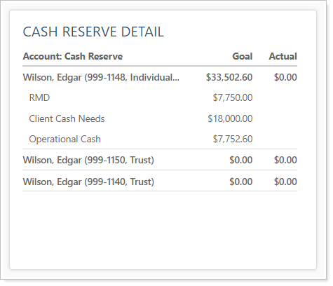 The new Cash Reserve Details widget shows cash reserve information at the group and account level. Here, you can compare actual and goal amounts. If you're viewing a group, you can see these details for each underlying account as well as for the group as a whole.