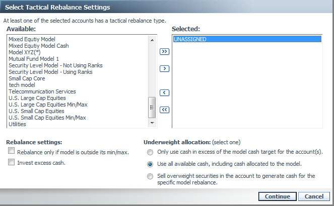 When performing a tactical rebalance, Advisor Rebalancing will now only rebalance the accounts that are associated with the models you select on the Select Tactical Rebalance Settings dialog.