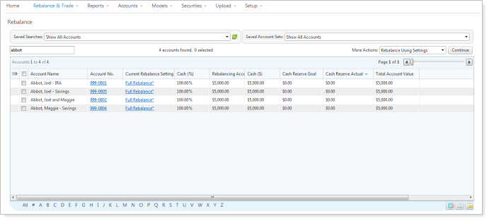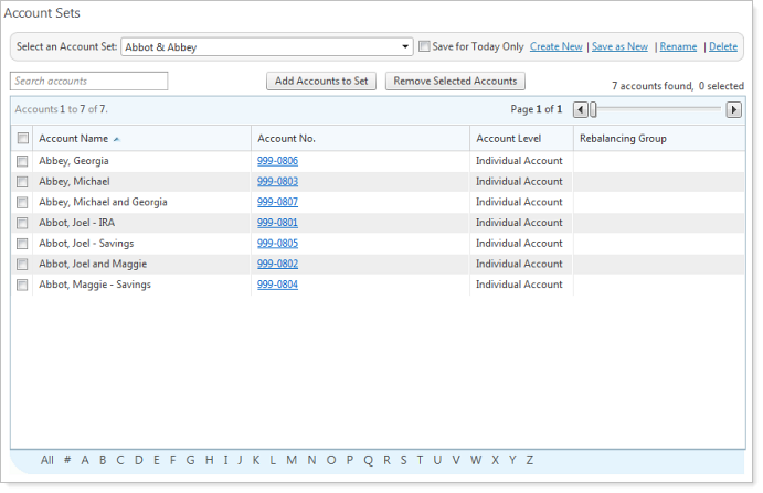 In our November release of Advisor Rebalancing, we delivered a way to create account sets, which help you quickly group accounts together. Unlike saved searches, the accounts you can assign to an account set don't have to be related - for example, you can create an account set for accounts that you can't easily group using a saved search. You can then use the Saved Account Sets list to show the accounts assigned to the account set.