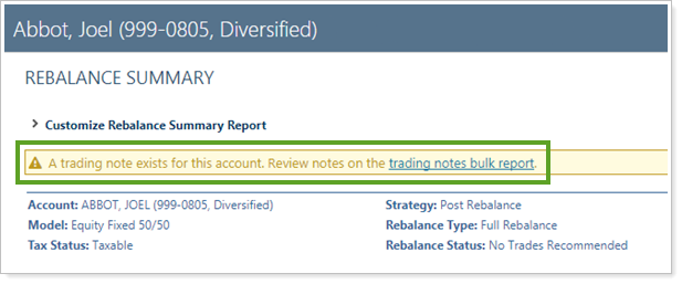 Notifications.Trading notes require an expiration date. Until that expiration date, various pages in Tamarac trading will let you know that a trading note is present so that these notes aren't missed. This allows you to document important, time-sensitive trading information.
