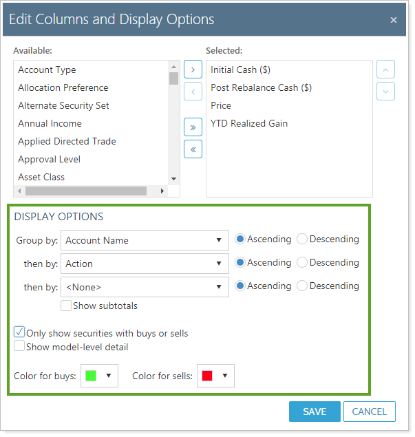 Group your trades and Customize How You See Trades.Group the trades on the Trade Review page by any column heading—for example, you can group the page by trade action so you can separate your buy and sell actions. When you group your trades, the dollars and shares values will be summed for your top three groupings. You can also customize whether you see model-level detail, and color code buys and sells.
