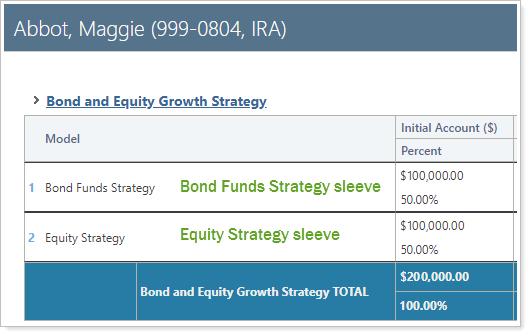 Trading in sleeve-level accounts is the same process as trading in any other account: You can run a rebalance and generate a custom strategy in the original account. Recommended trades during a rebalance are based on the allocations of the models that represent the account's sleeves. When you rebalance an account with sleeves, you're still rebalancing an individual account, but the sleeve allocations determine in which sleeves those assets are placed. There's no need to manually split or track assets.