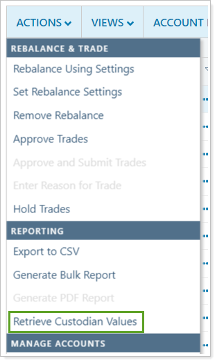We added the Retrieve Custodian Values action on the beta version of the Rebalance Page. If you use an applicable custodian integration, choosing this option will refresh custodian data columns.