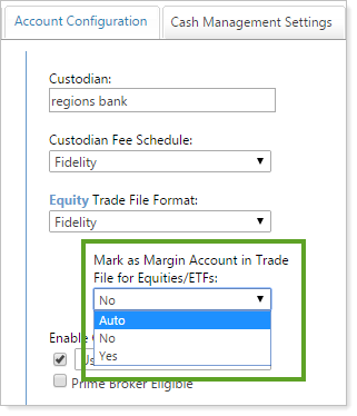 If you have Fidelity as your Equity Trade File Format, you'll see the option to select Auto in the Mark as Margin Account in Trade File for Equities/ETFs list. This feature must first be enabled by Fidelity; to use this feature, contact your Fidelity representative to ensure your firm has been enabled.