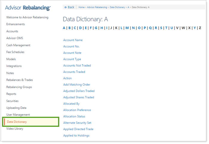 The Data Dictionary is an alphabetical list of common terms you'll see throughout Advisor Rebalancing. You can find the Data Dictionary by accessing the link on the left-hand column of the Support & Training Center, or you can find definitions for terms by using search.