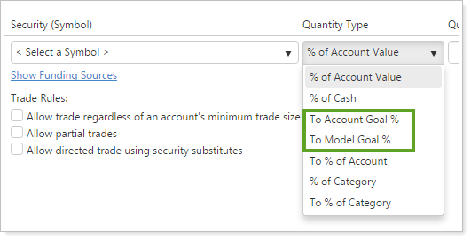 You now have additional options when you create directed trades that trade individual securities to model goals without completing a full rebalance. We've updated one existing directed trade quantity type and added another quantity type to give you more options to trade to model goals: