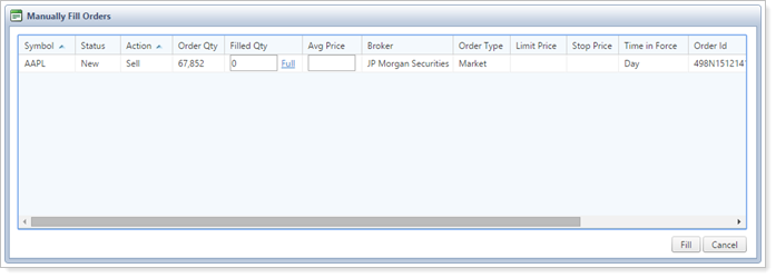 Manually Fill OrdersChoosing this option gives you the ability to mark orders as manually filled outside of Advisor OMS and enter that information into Advisor OMS using the Manually Fill Orders pop-up window. There, you can enter quantity information and average price. These orders can then later be allocated manually.