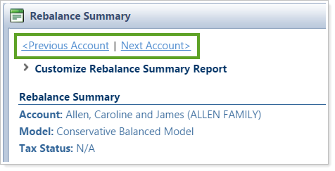 To improve your navigation experience, we've added Previous Account and Next Account links on the Trade Summary and Rebalance Summary pages, allowing you to navigate directly within those pages. Now you don't have to close out of one summary to view the next summary.
