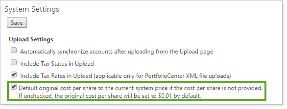 On the System Settings page, under Upload Settings, you'll now see the Default original cost per share to the current system price if the cost per share is not provided check box which controls this feature.