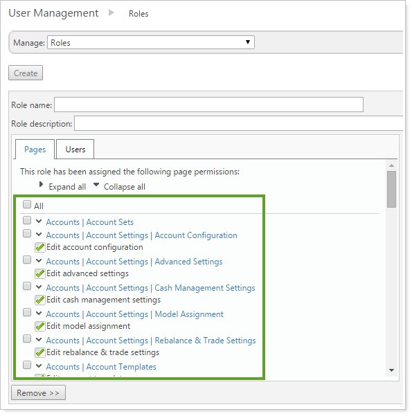 Now, the options you see when you create a role or edit Pages within the Roles page mirror Advisor Rebalancing menus, helping you find the appropriate permissions.