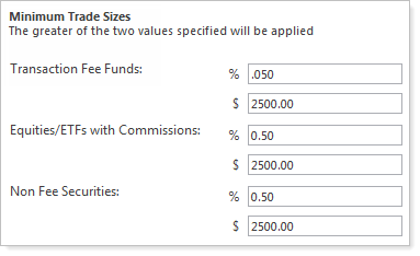 On the Rebalance & Trade Settings tab, under Minimum Trade Sizes, you can specify a percentage and a fixed dollar amount for transaction fee funds, equities and ETF's with commissions, and non-fee securities. Advisor Rebalancing will apply the greater of the two values for the minimum trade size.
