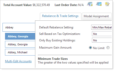 In previous releases, Advisor Rebalancing allowed you to specify a minimum trade size as either a fixed dollar amount or as a percentage of account value. However, some users wanted Advisor Rebalancing to use the larger amount - either the percentage amount or the fixed dollar amount. With this release, you can specify a percentage and a fixed dollar amount for the minimum trade size. Advisor Rebalancing will apply the greater of the two values for the minimum trade size.