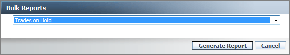 When running the report from the Trades on Hold page, select the accounts that contain held trades and on the More Actions list, click Bulk Reports. In the following dialog, click Trades on Hold, and then click Generate Report.