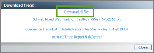 As you compete the trading process, the Trade Actions dialog enables you to create several files, such as a Trade file, compliance report, and an Account Trade bulk report. With this release of Advisor Rebalancing, the Download file(s) dialog allows you to download the files individually, as before, but also enables you to download all the files in a .zip file for ease of use and convenience.