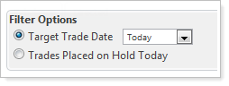 On the Trades on Hold page under the Rebalance & Trade tab, you can use the Filter Options box, to display held trades according to their Target Trade Date (either Today, All, Overdue, a date range, or those trades placed on hold on the current day). When you apply or delete the held trades that display based on the specified filter criteria, only those meeting that criteria are affected (either traded or deleted). The trades that fall outside of the filter criteria remain on hold.